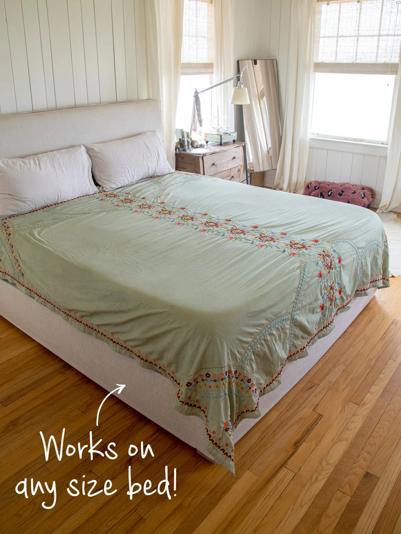 The Embroidered Coverlet is so beautiful! It’s a lightweight, embroidered king size coverlet that actually looks great on ALL bed sizes! Throw it on your bed or keep it folded at the foot for an extra layer of warmth and decoration… it will make your bedroom or dorm room come to life! We even like using it as a table cover, it’s just so pretty!
