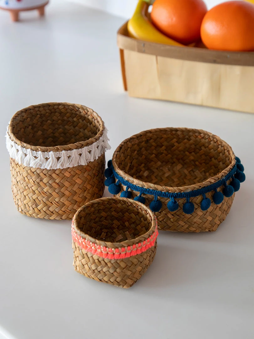 This set of 3 seagrass woven baskets makes the perfect little catch-all dishes! We love using them as drawer storage or on our counter for little things like Q-Tips, hair ties, jewelry, keys & more! Each one features decorative trim that will bring life to your bathroom, bedroom, desk… anywhere