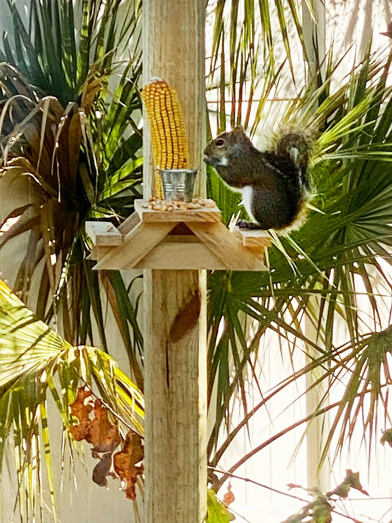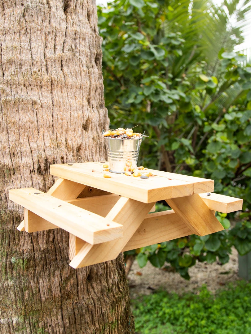 Just the IDEA of a squirrel hanging out on a little picnic table eating corn, nuts, or seeds got us so excited that we HAD to make Squirrel Picnic Tables for everyone to enjoy! They are easy to mount to a fence or a tree… make sure you can see it from your favorite morning coffee spot!