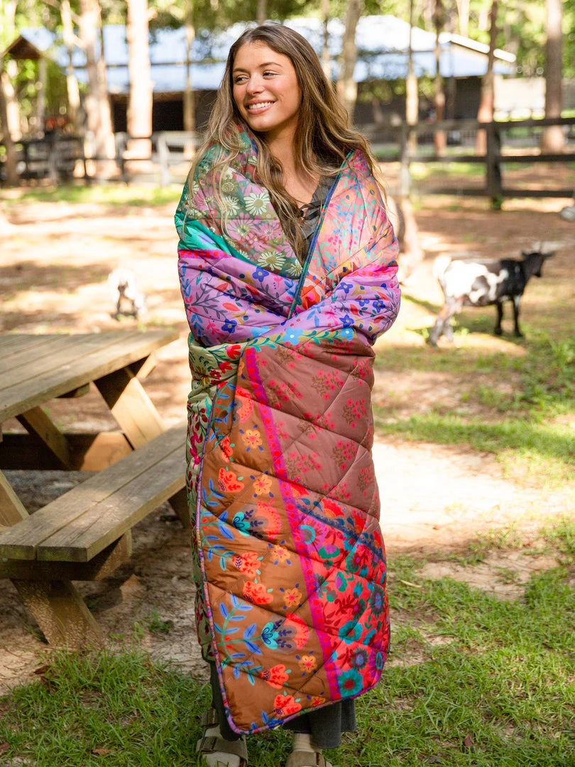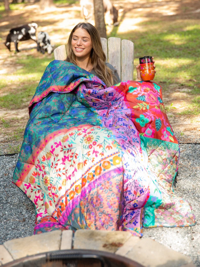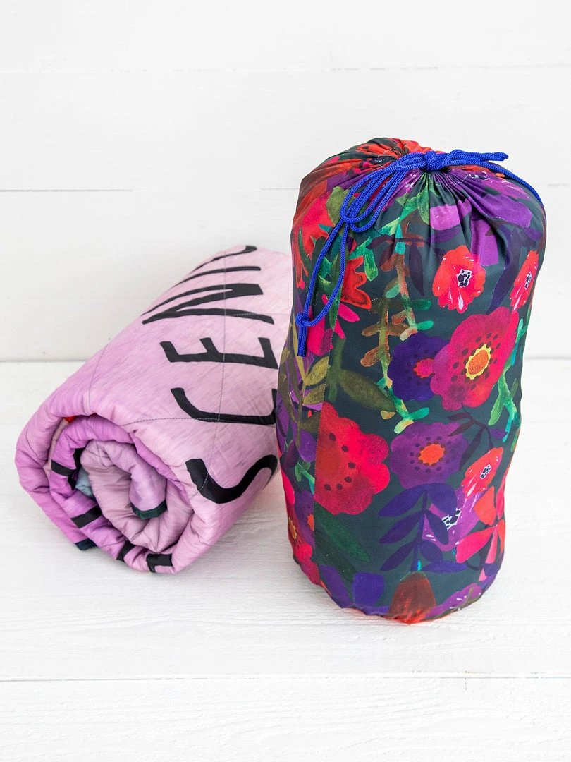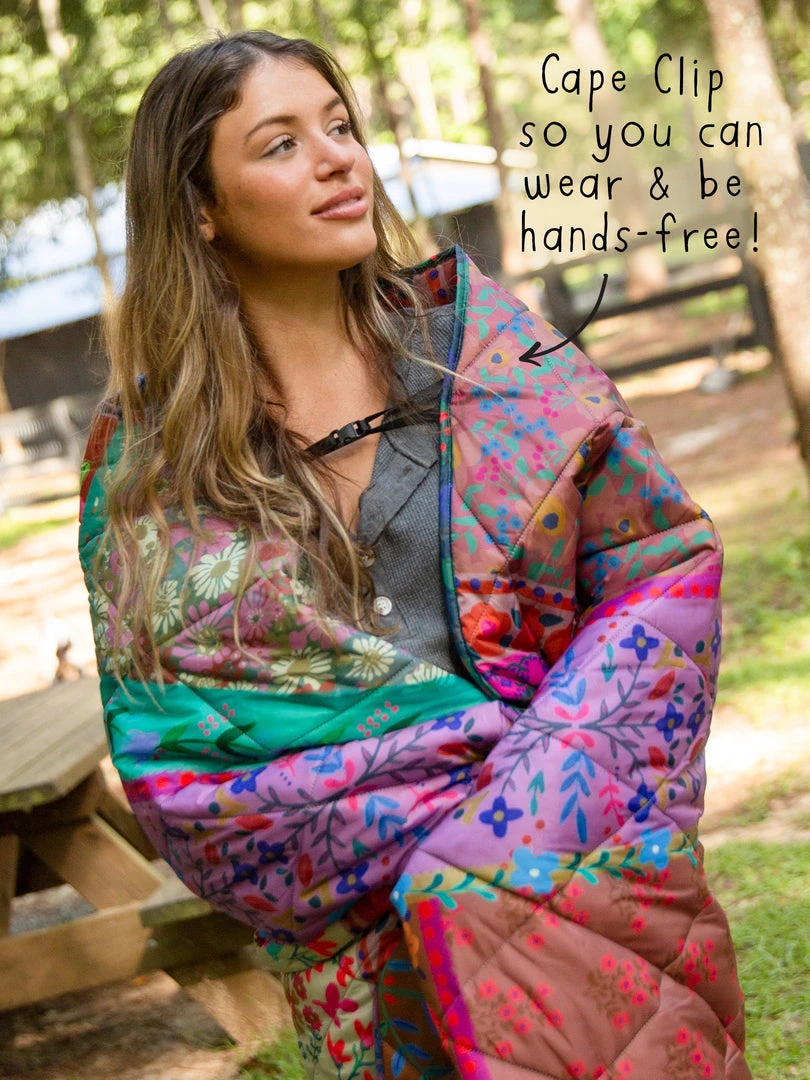 The Camp Quilt is so cool and we’re absolutely loving it! It’s washable, lightweight & easy to pack! It’s wind & water resistant, making it perfect for camping and beach nights… but can also be used indoors for sleepovers or even to keep in your car for when you need it! It’s like a sleeping bag without the zipper! It features corner loops to stake it to the ground and a cape clip so you can wear it and be hands-free! While our camp blankets are not temperature rated, they should keep you plenty warm. Need something warmer? Layer with 2 blankets!