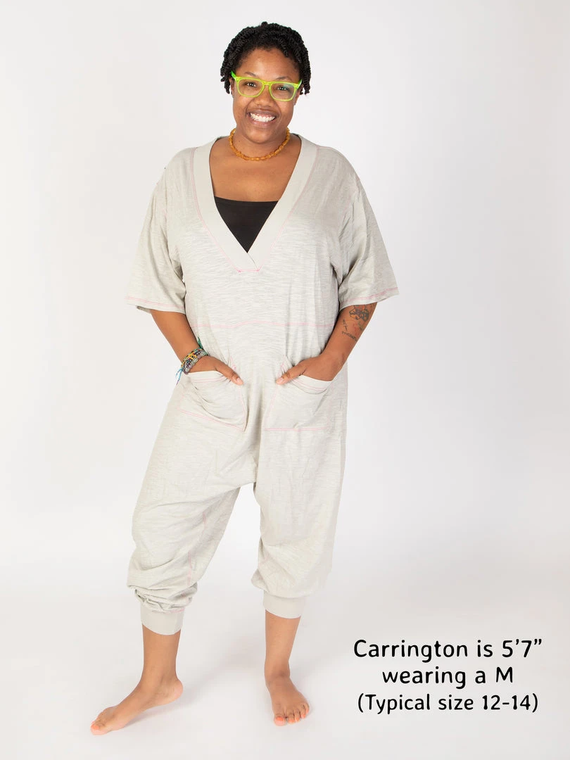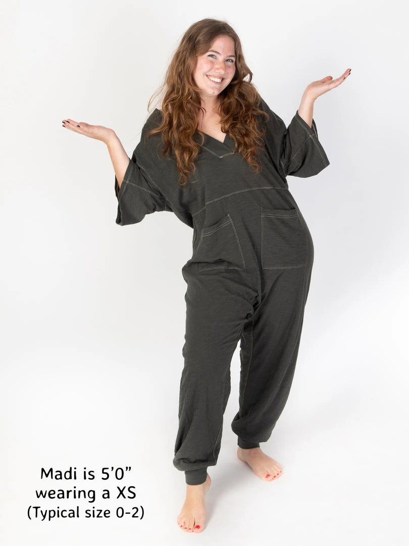 There’s nothing comfier than our Charlie Jumpsuit. Its oversized, slouchy design was made to keep you COMFY… it might just become your favorite thing to wear. The deep v-neck makes it just perfect for pairing one of our boho bandeaus or a cami underneath for a fun look. No matter the season, it’s a good time to wear it. The generous pockets can hold your phone, earbuds, or anything you want close to you. You’ll get tired of hearing, “Where did you get that? It’s so cute!” We love the banded legs because it fits any length! Size down if you don’t want it oversized. It’s so easy to just throw on to head out the door or to just stay curled up on the couch.
