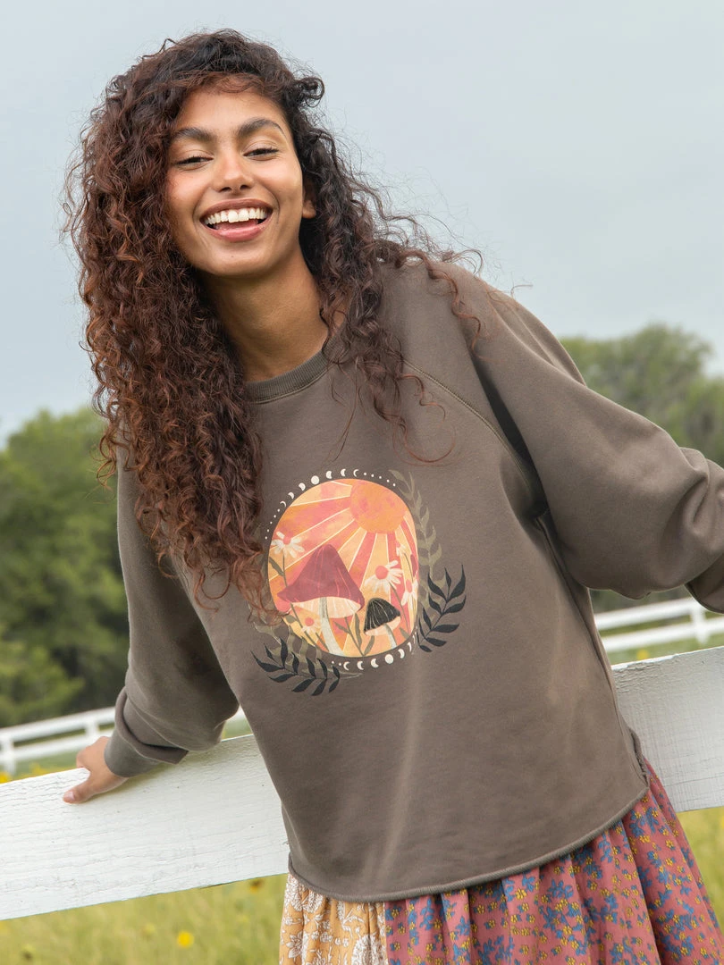 Your new favorite Sweatshirt! This pullover Cropped Sweatshirt features the softest knit fabric, great graphic detail, a full-length raglan sleeve with crew neck, and a rolled hem. It has a relaxed fit and is generously cut, making it SO comfy and easy to wear! It looks super cute paired with your favorite shorts or jeans by day or with cozy sweatpants by night! You will literally never want to take it off!