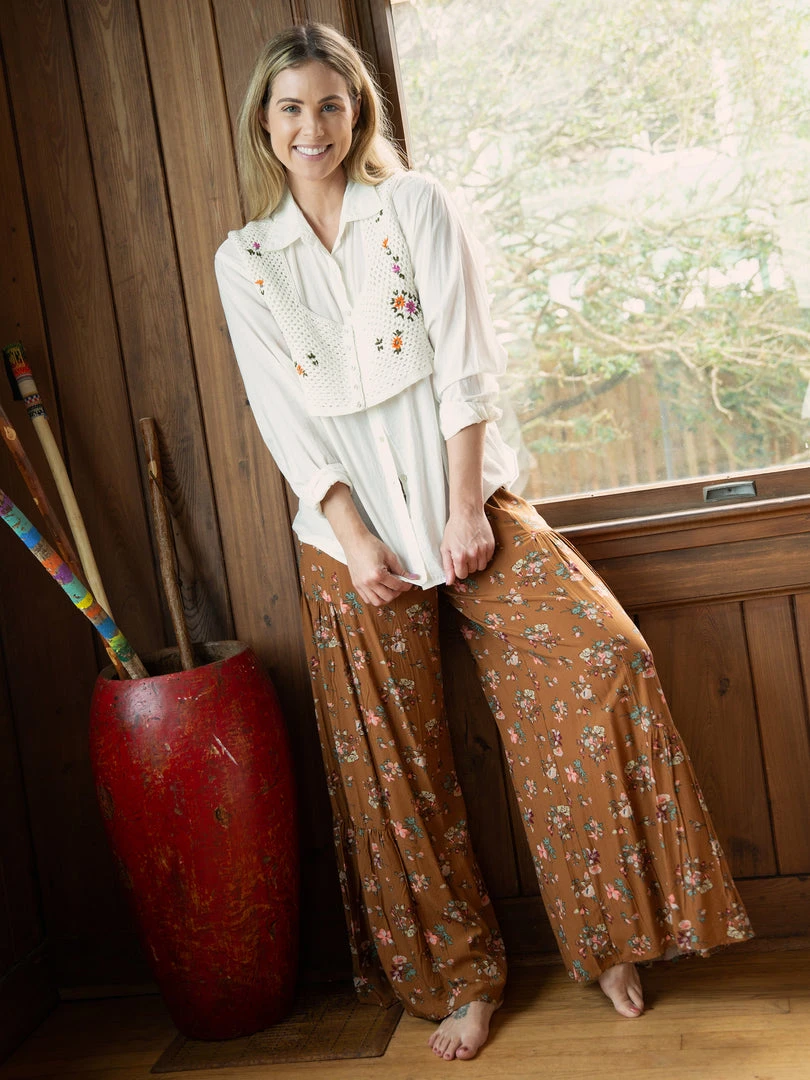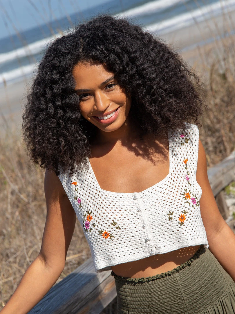 We love the Embroidered Hazel Vest! This crocheted vest features cute embroidered flowers on the front and back and little pearl buttons. It’s cropped and while it looks good worn on its own, it’s really meant for layering over dresses or your bathing suit! It’s such a fun piece to have for the warmer season!