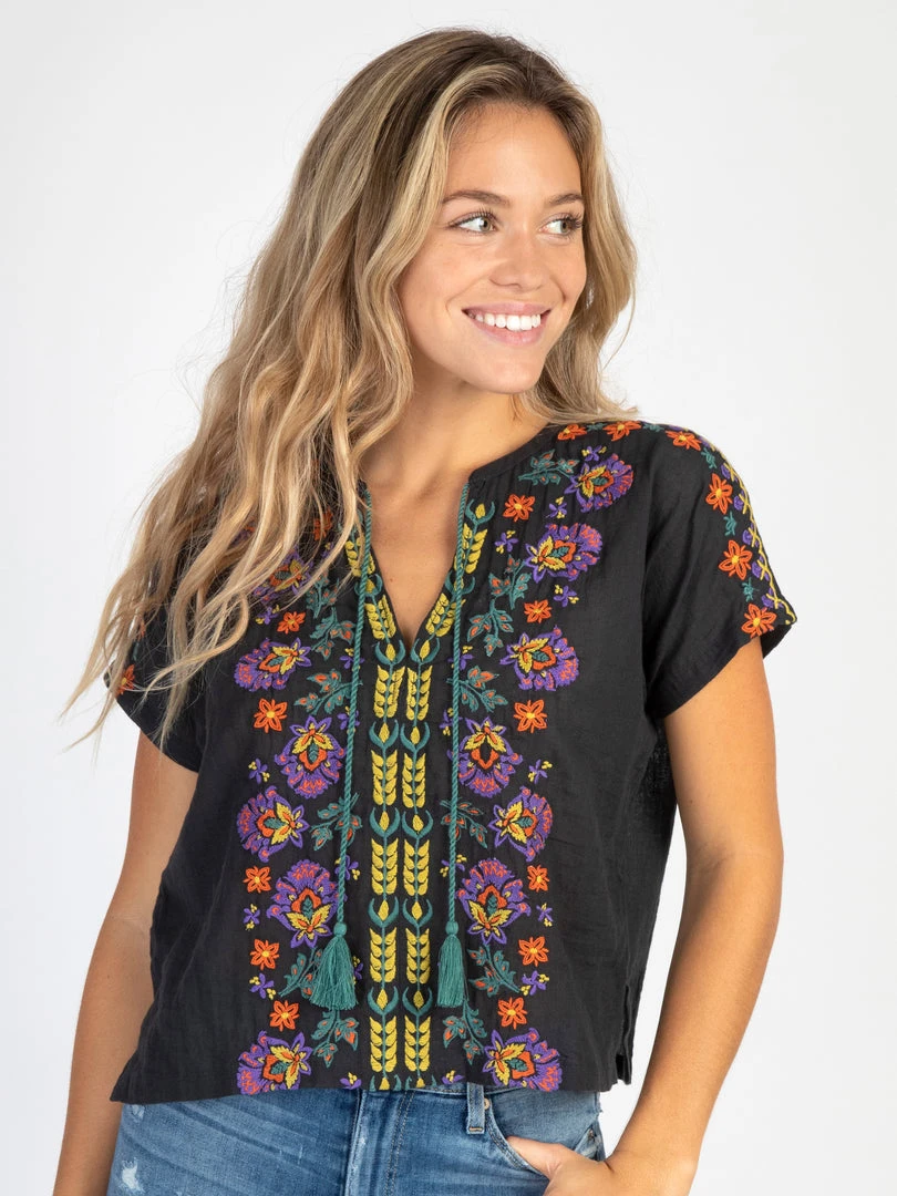 Cool. Cute. Carefree. Meet our cropped, Embroidered Tassel Top! This soft cotton top is embroidered in bright and beautiful colors. Matching tassels show off the v-neck and complete the bohemian look. Gorgeous embroidery goes all the way down both short sleeves with eye-catching detail. Wear it with jeans, shorts, or one of our daisy skorts! You can even throw on a jean jacket for a chilly night. Your style will stand out wherever you go.. this top can make an appearance anywhere!