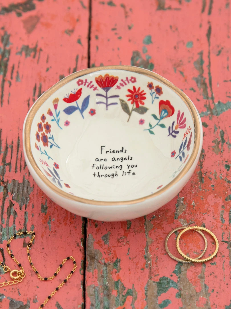 Thoughtful gifts are the best gifts. Our hand-molded Giving Trinket Bowl is the gift you can give to anyone! Every time they use it, they’ll be reminded that they are loved. You can even gift one to yourself to keep by your sink to hold your rings. Each bowl has a gold-rimmed edge and a sweet sentiment that will make anyone’s day. They’re the perfect size for bracelets, rings, or any tiny treasure. Keep one on your desk to hold paperclips, post-it-notes, or your earbuds. We love to give everyday items a home in something special that will make you smile. By holding your important things in our Giving Trinket Bowl, you’ll always remember where you left them!
