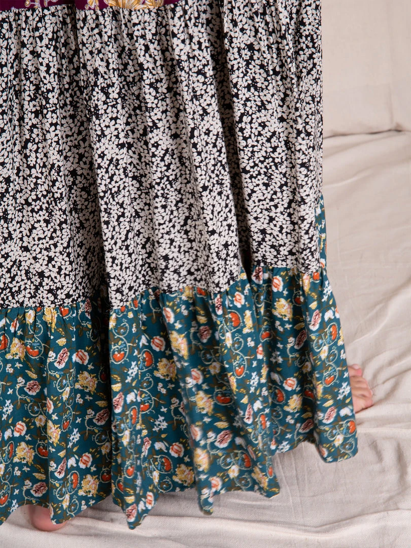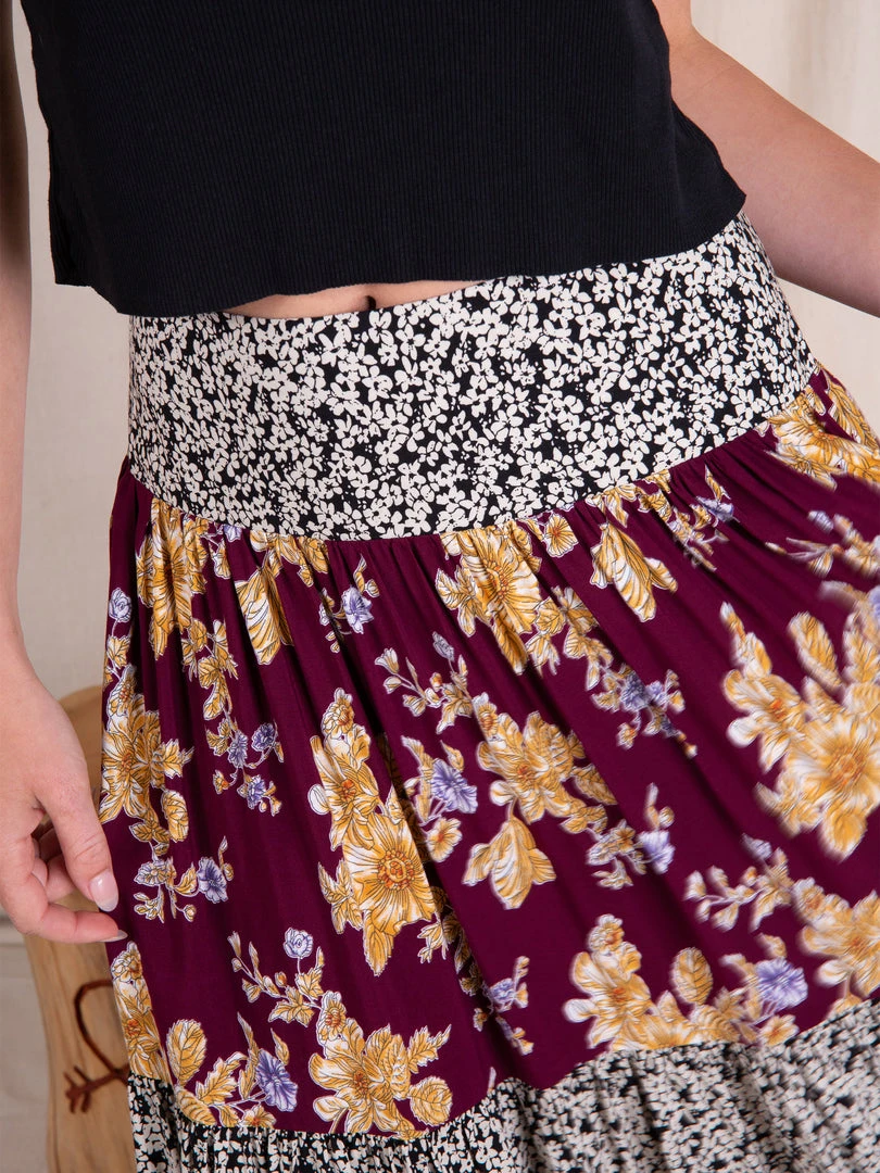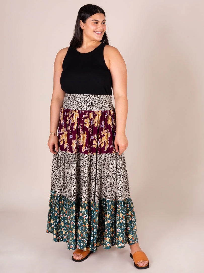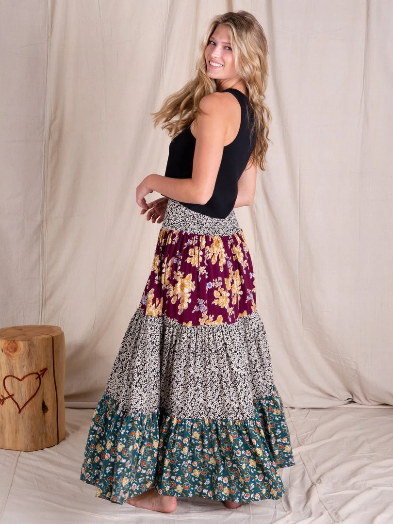 The Hanna Maxi Skirt is one of our most loved skirts! The bohemian mixed prints, billowy tiers and wide waistband with smocked elastic in the back makes it incredibly flattering and effortless. It’s such a pretty skirt that you can’t help but feel beautiful in it!