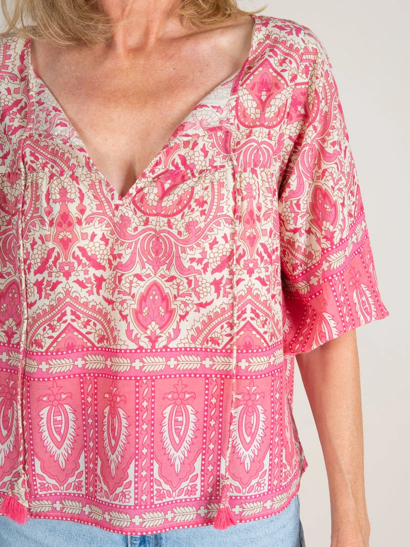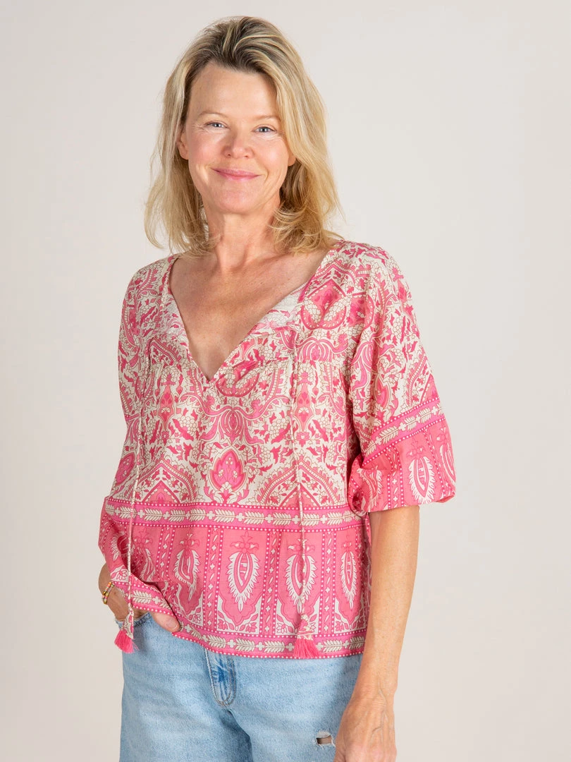 How pretty is the Heidi Blouse?! It features a colorful border print, v-neckline, elastic armholes and a wide & boxy silhouette! It’s the kind of top you can just throw on and instantly look put together! It makes a great party top or for going to dinner with friends!