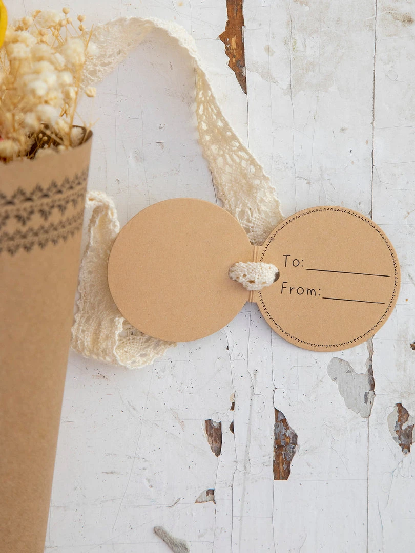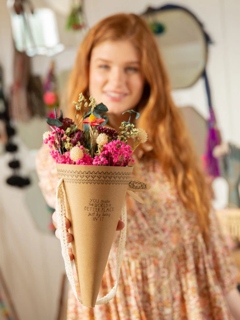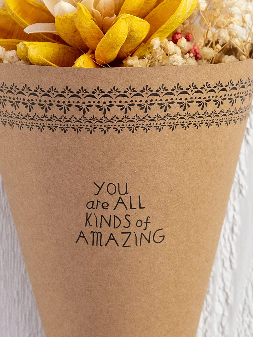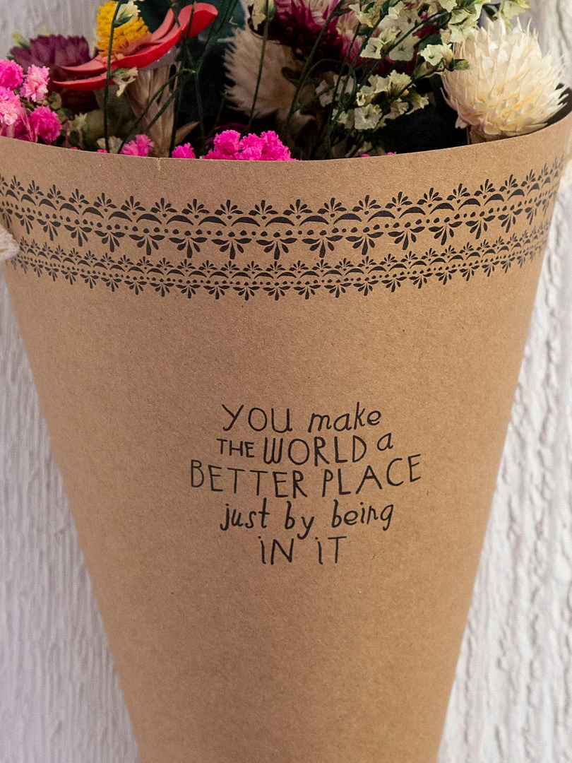 We just love giving (and getting) flowers so much that we arranged beautiful dried floral bouquets that will last forever! Each Forever Floral Bouquet has a sweet sentiment printed on the craft paper wrap with a crochet trim handle and a to/from hangtag making them the perfect gift! They are lovely hanging by the crochet trim or arranged in one of our bouquet vases!