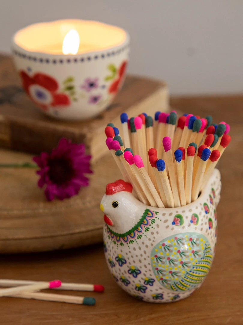 The cutest Matchstick Holder ever! This ceramic holder comes filled 70 four-inch matches in assorted colors and a striker on the bottom for easy lighting! Pair it with one of our candles to make the perfect housewarming gift that is functional and a pretty piece of décor!
