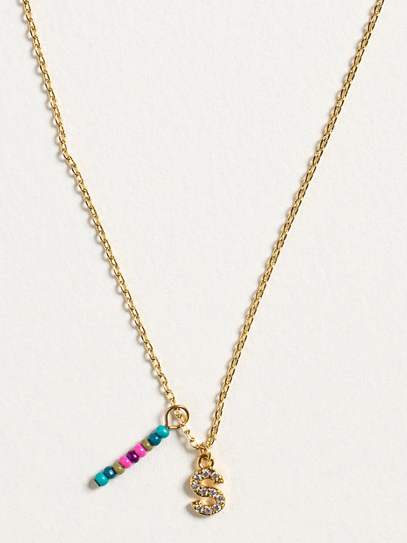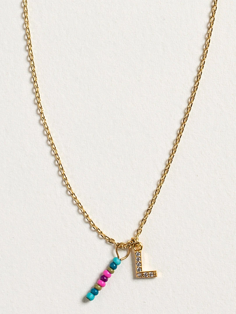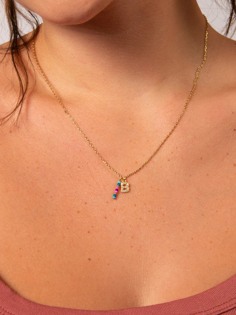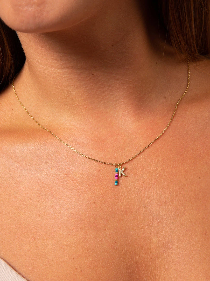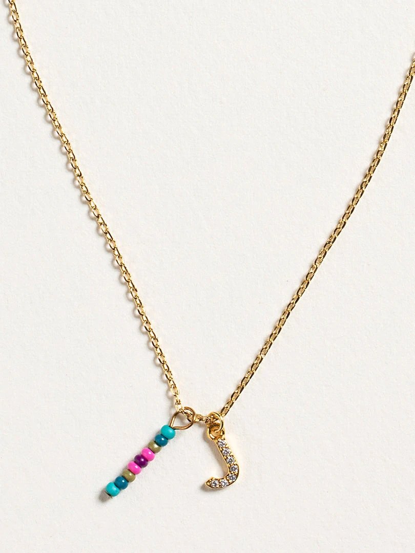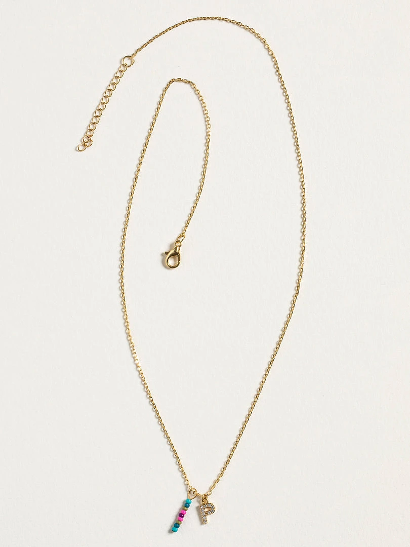 Personalized gifts are the best for giving! This necklace features a single gold-plated initial charm with tiny rhinestones and a colorful hand-beaded charm to add to its touch of personalization. It comes in the prettiest givable bag and can adjust up to 19 inches in length, making it great for wearing alone or with our other necklaces for a layered look!