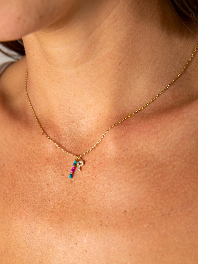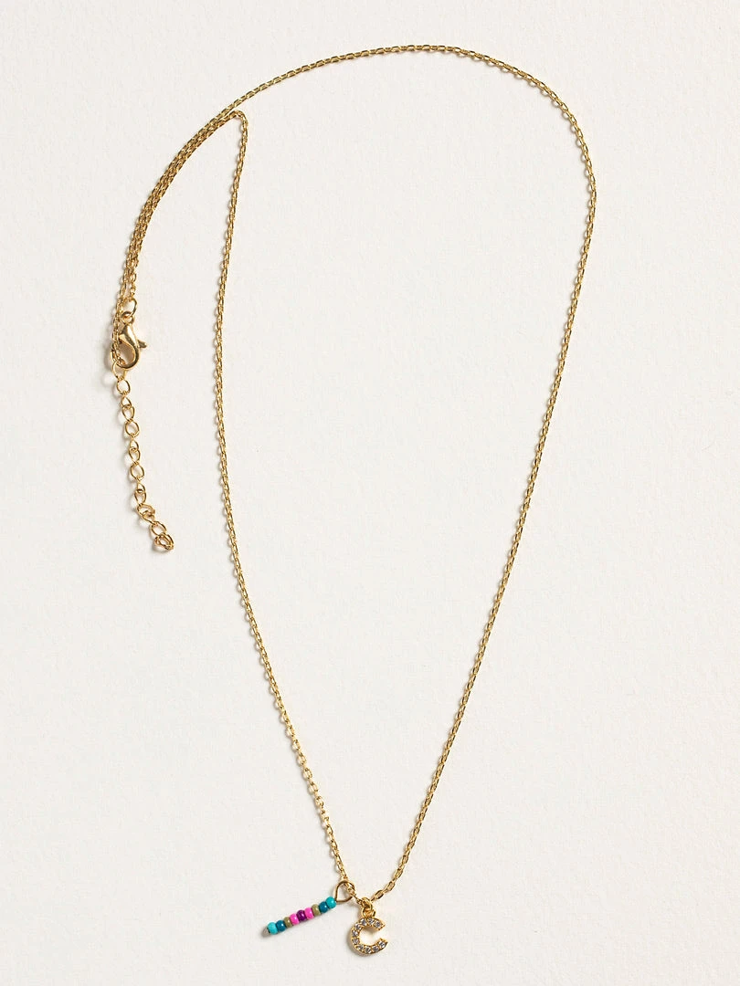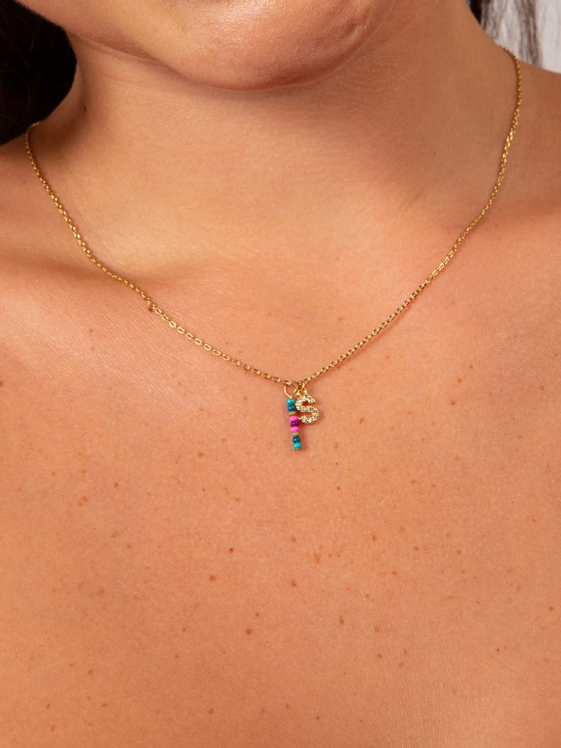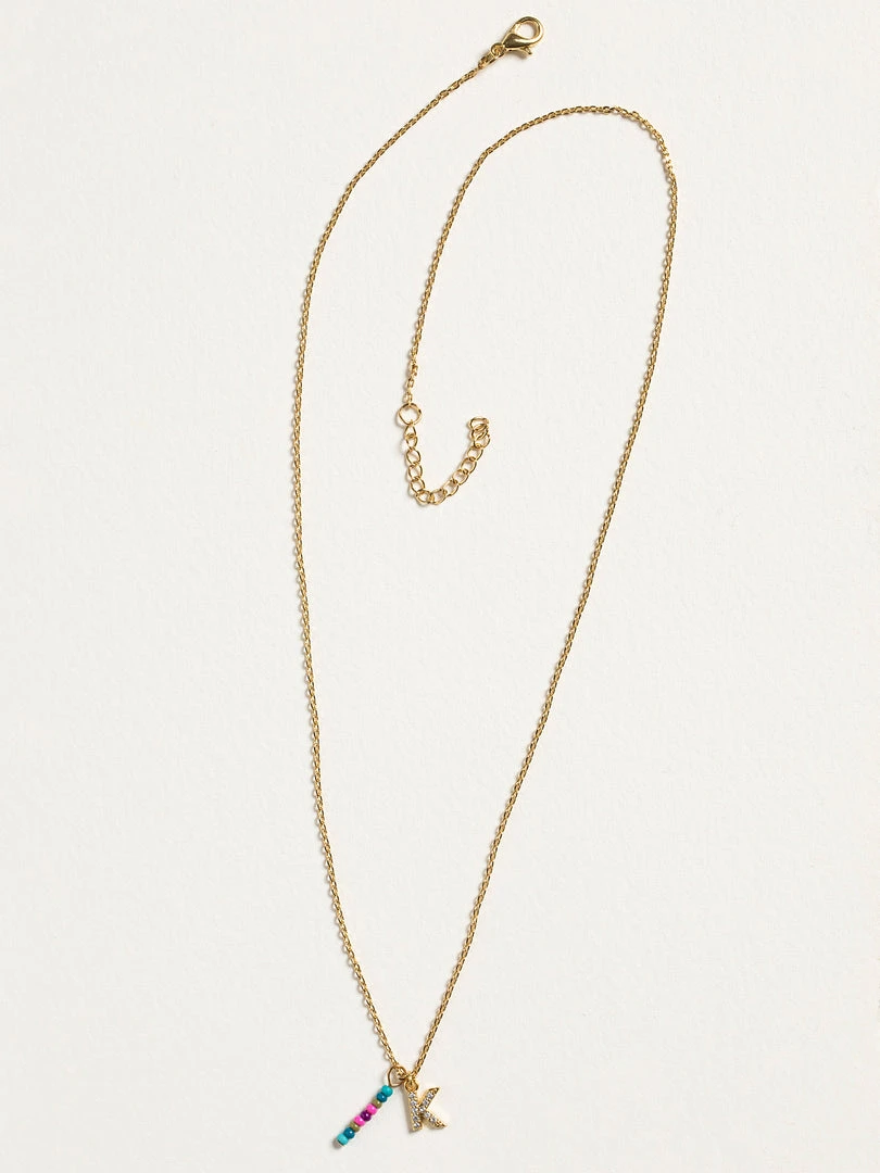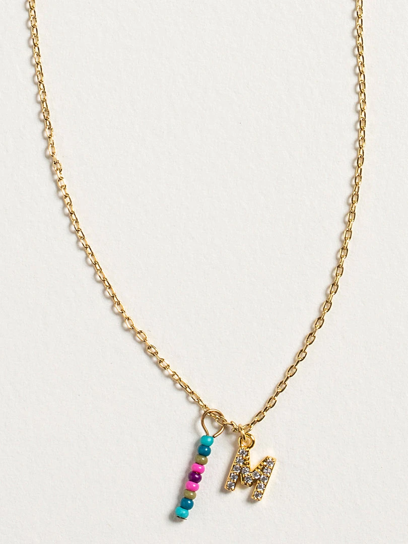 Personalized gifts are the best for giving! This necklace features a single gold-plated initial charm with tiny rhinestones and a colorful hand-beaded charm to add to its touch of personalization. It comes in the prettiest givable bag and can adjust up to 19 inches in length, making it great for wearing alone or with our other necklaces for a layered look!