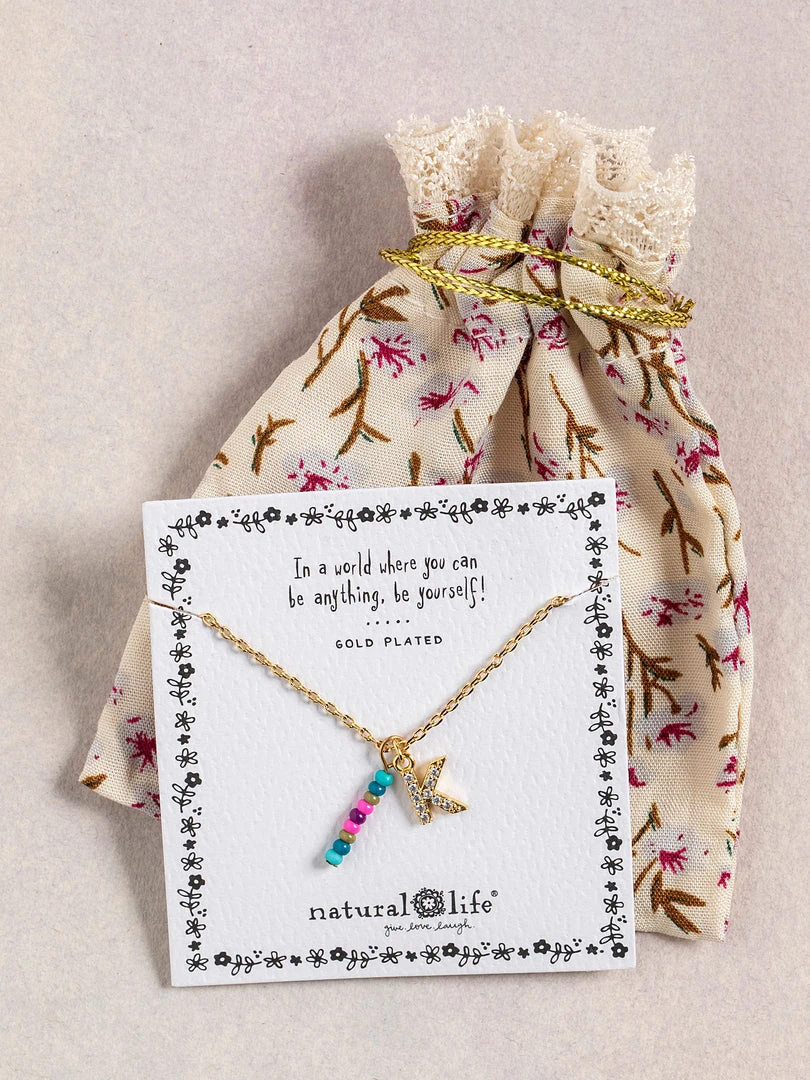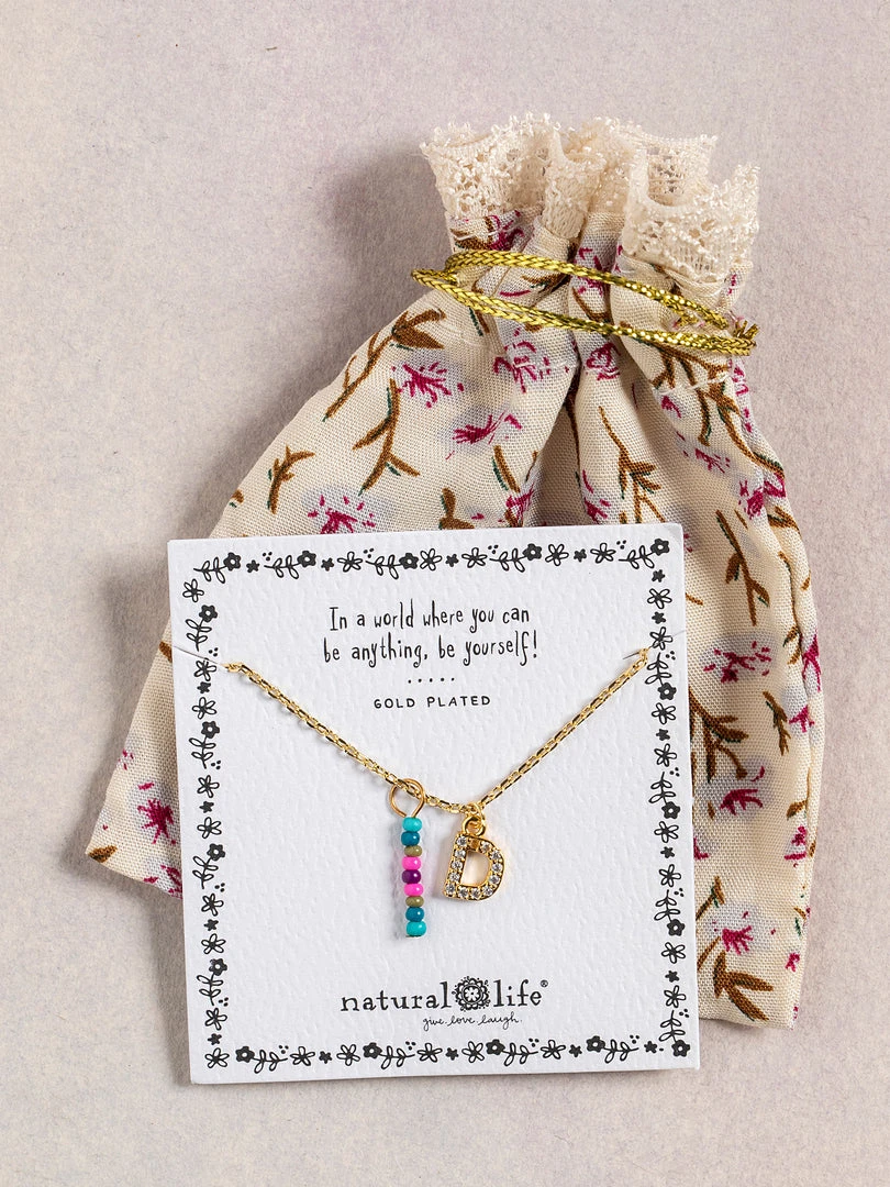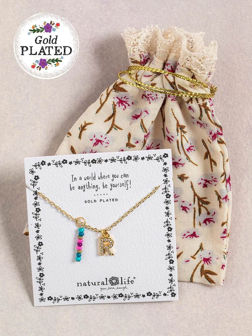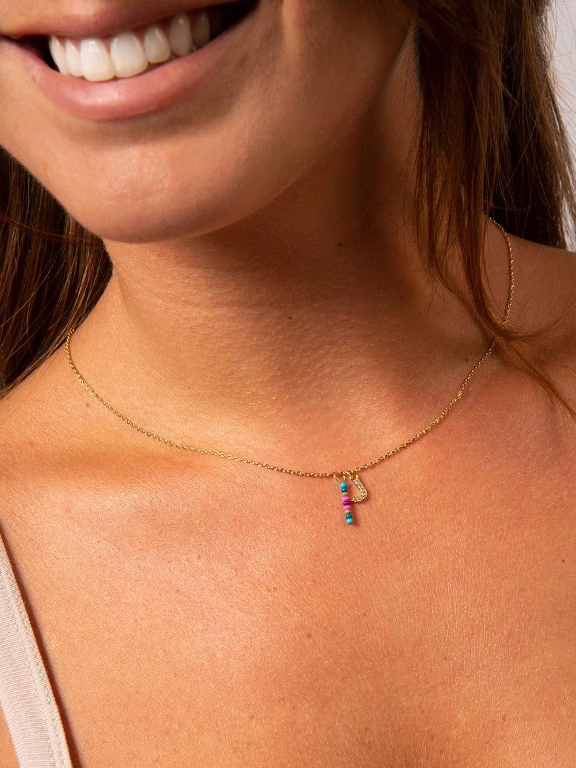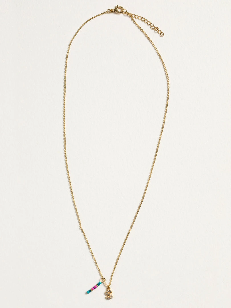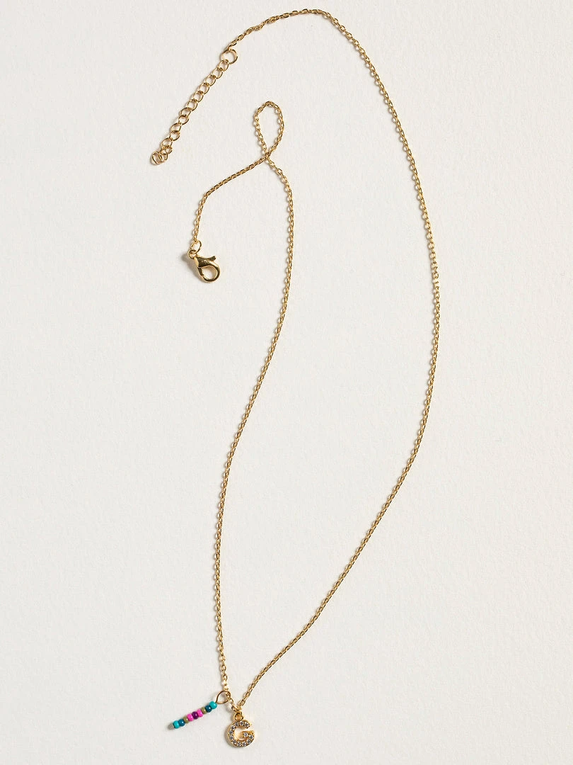 Personalized gifts are the best for giving! This necklace features a single gold-plated initial charm with tiny rhinestones and a colorful hand-beaded charm to add to its touch of personalization. It comes in the prettiest givable bag and can adjust up to 19 inches in length, making it great for wearing alone or with our other necklaces for a layered look!