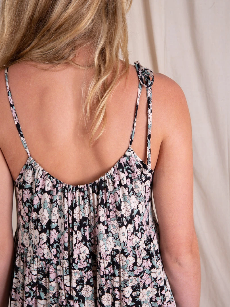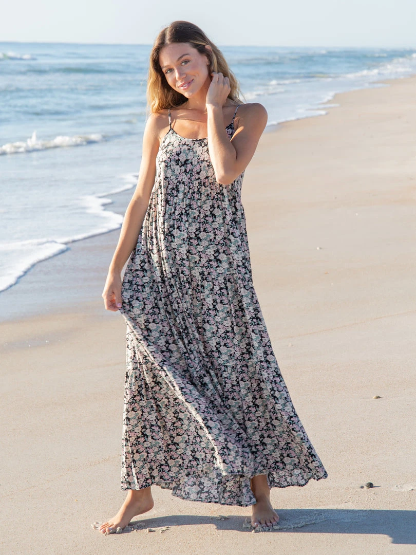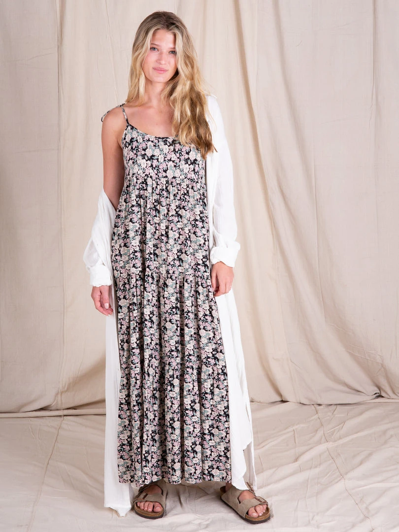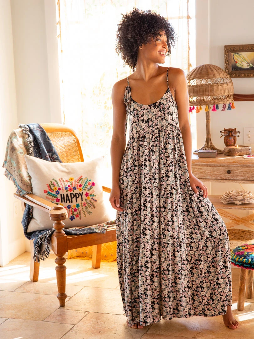 Who doesn’t love an easy dress? The Madi Slip Dress features a sweet boho floral print, tiers and an adjustable tie on one shoulder. It’s maxi length and is so flowy and feminine. It’s one of our favorites for sure!