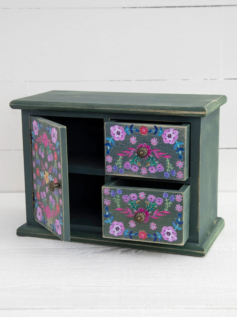 The Maia Mini Dresser is the cutest mini dresser to put on your big one! It features a pretty painterly floral design and rustic wood finish. It has 2 drawers and a cabinet door with a shelf to hold your favorite little keepsakes, jewelry & hair accessories! It makes a super sweet gift for someone you love, too!