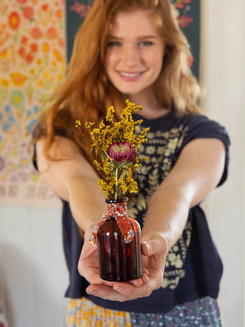 We love placing these little bottles of dried flowers tucked around our living space in any nook, nightstand or shelf. Each little arrangement is made from real preserved flowers placed in an amber glass bottle and tied with a cute raw edge printed fabric. They’re sold individually, but look so cute in clusters or in different rooms… so we always get at least one of each! They also make a sweet little gift for someone you love!
