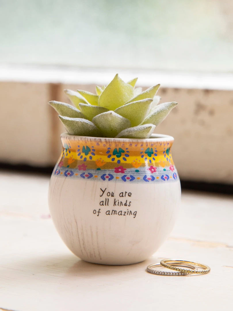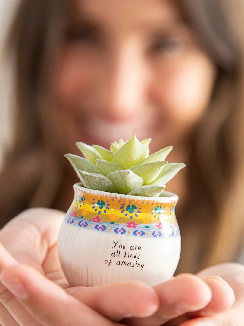 This little succulent is the CUTEST thing ever! Tiny faux succulents and heartfelt sentiments bring warmth and life into any space, like your desk, a window or on a shelf! They seriously make the perfect gift! Succulent and container combinations are sold as is.