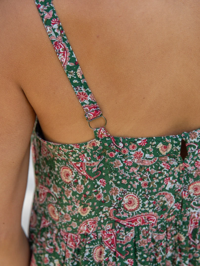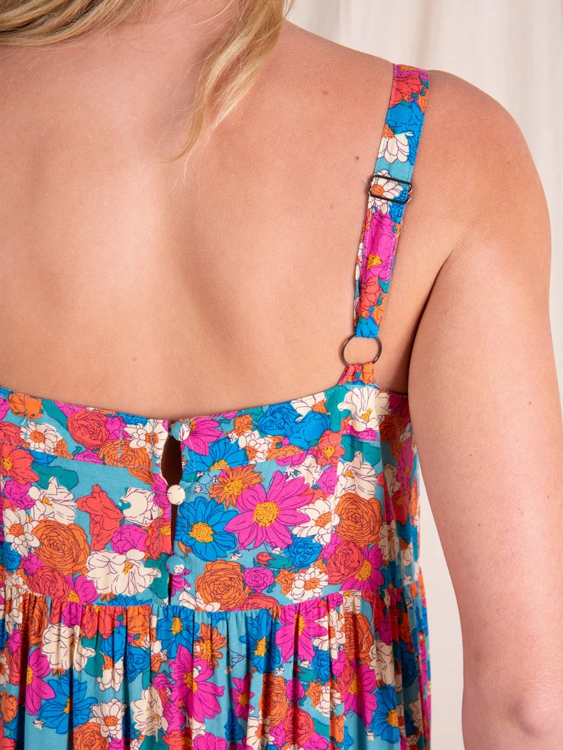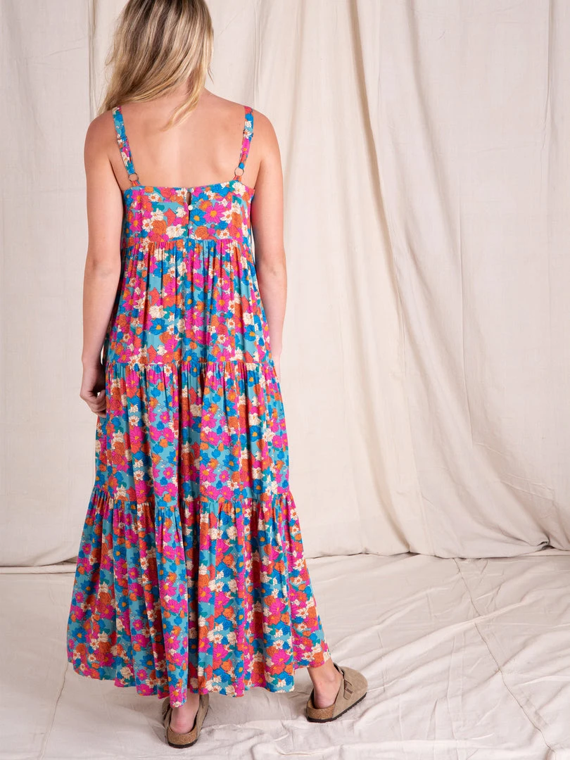 The Patricia Dress is just so beautiful! It features a button closure on the back, tiers, adjustable straps and pockets! The fuller skirt makes it flowy and fun to wear and the colorful floral print will make you feel so happy while wearing it!