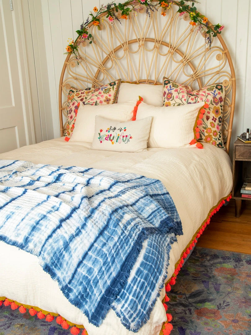 The Cotton Gauze Quilt features a special dyeing technique called Shibori, where the cloth is twisted dyed in indigo! This quilt is a cotton gauze and each one is hand-stitched and slightly different and unique. We love Bungalow Bedding, so we had so much fun designing this for our own beds!