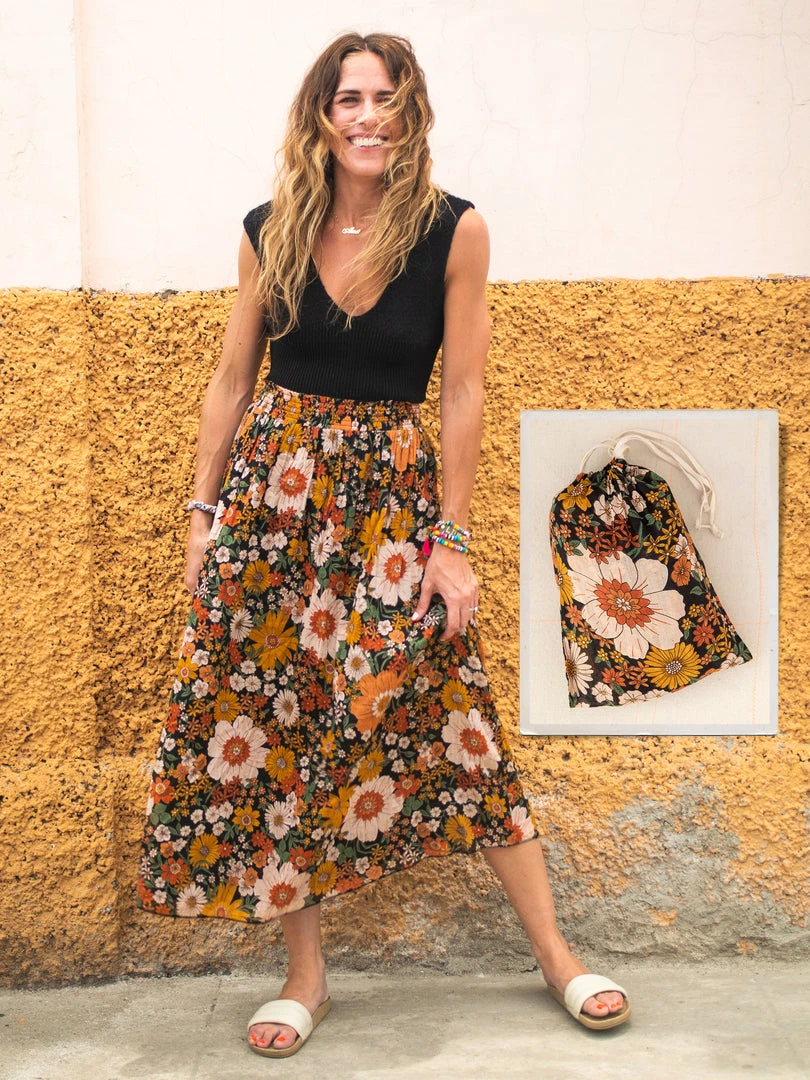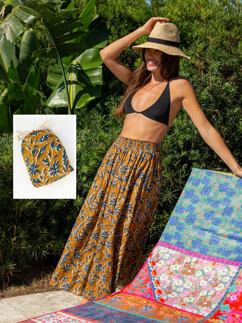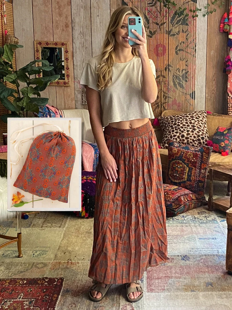 Inspired by our love for traveling… and traveling lightly, this Skirt-In-A-Bag is the coolest concept! It features cotton that is not only super soft, but the skirt actually looks CUTER when it’s crinkly! The best kind of crinkle is when you twist it up and stick it in the cute printed bag that comes with it! It’s so easy to pack in your bag for trips and pairs perfectly with our tees & tanks! Oh, and the waistband is smocked, so it is flattering on all different body types! The more you have the better! Fill your drawer with tons of designs!