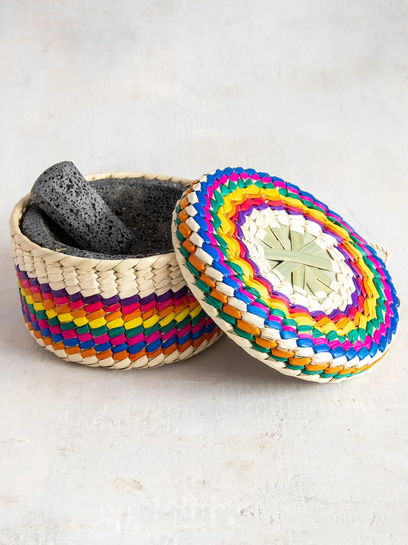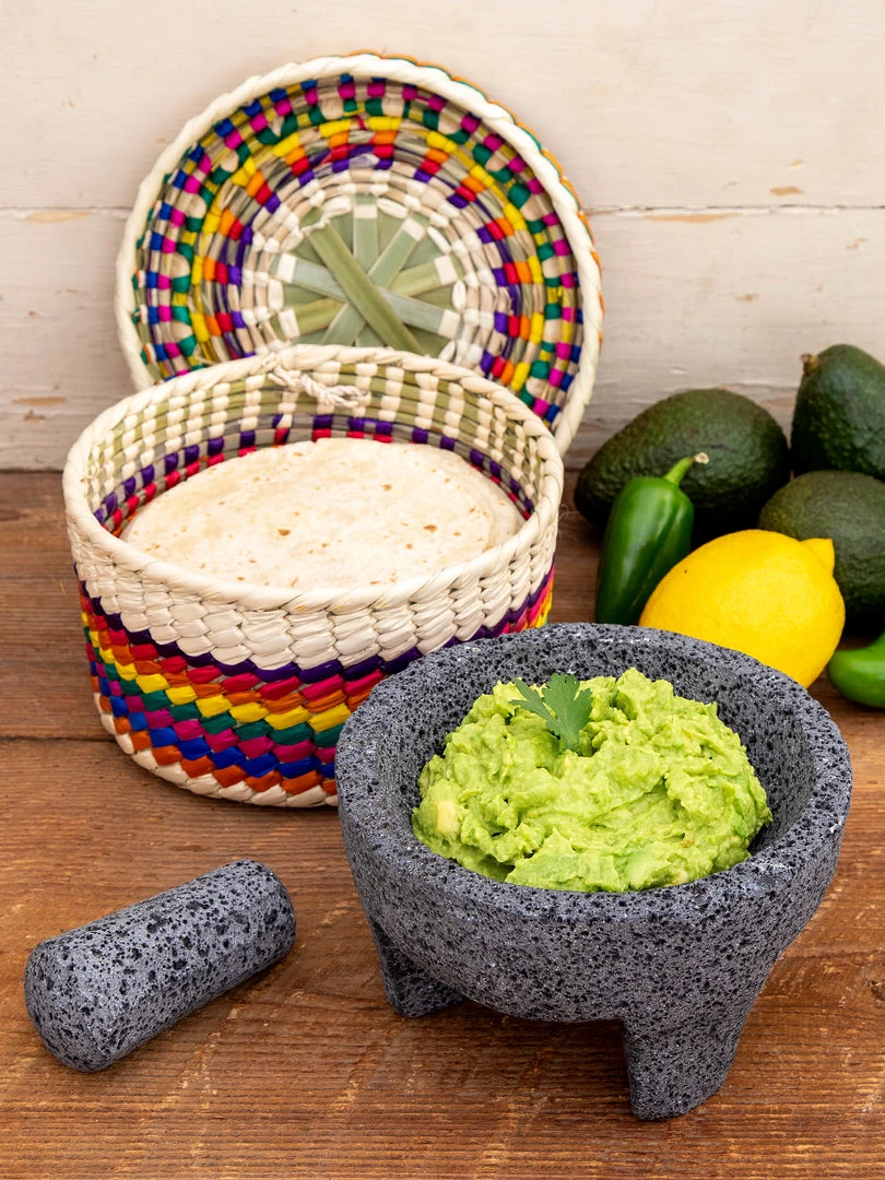 The Molcajete & Tortilla Basket is one of our favorite things we’ve made! The mortar and pestle are handmade from lava rock by artisans in Mexico. It’s the traditional tool for making guacamole and salsa fresca that you can blend and serve right out of the bowl! The inside of the bowl is textured for crushing whole spices into spice blends or rustic sauces. It comes in a traditional colorful palm frond handwoven basket that will keep tortillas warm at the table while you’re passing the food around. You can even line the basket with lettuce leaves to use as an all-purpose serving bowl!