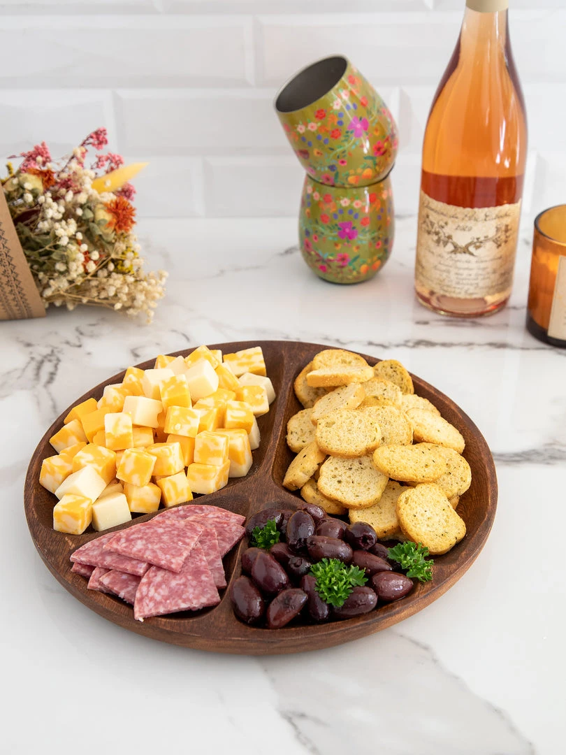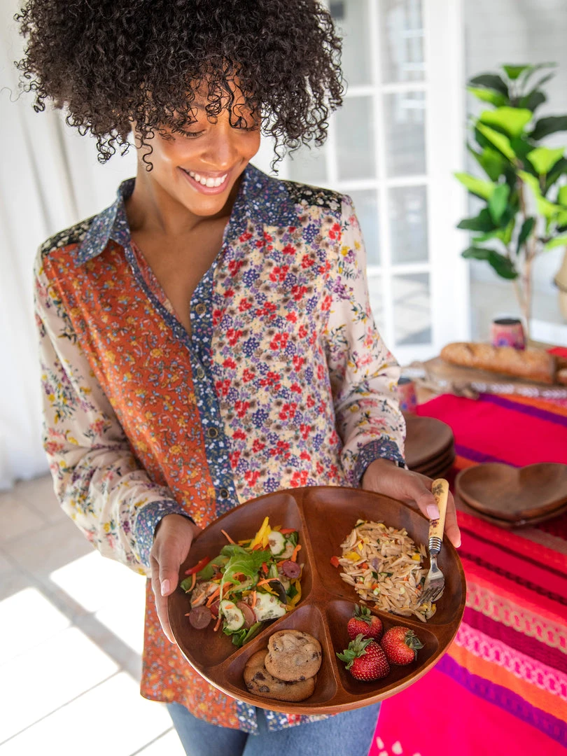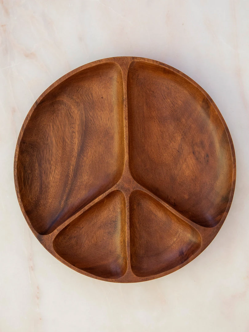 During our global travels, we stayed at a rustic resort and they served all of our food on wooden plates and platters and they even used wooden serving spoons! They were so cool and inspired us to design something similar for our own homes! The Acacia Peace Platter is the perfect piece for fun family dinners & hosting guests! It comes with four individual sections to hold dips, olives, cheeses, veggies… anything small to snack on! It’s hand-carved and so pretty, you’ll want to keep it out even after your guests go home! It’s made from real acacia wood, so it is hand wash only.